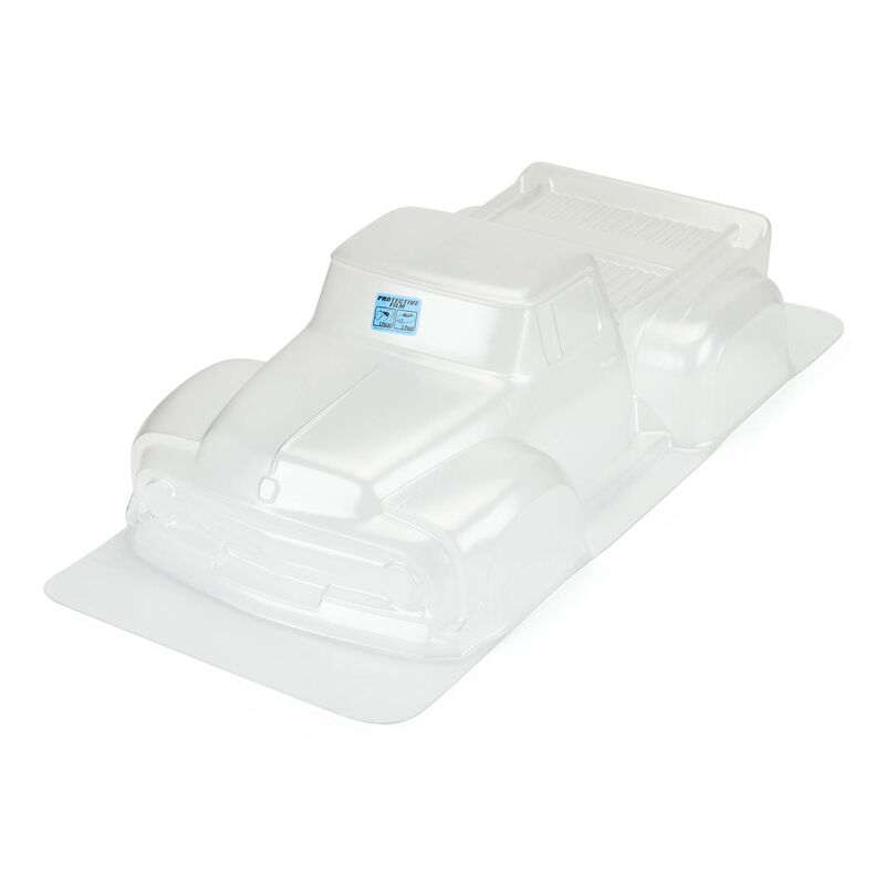 This is a 1956 Ford® F-100 Pro-Touring Clear Body for Short Course. Do you have the need for speed? Then check out Pro-Line's new Ford® F-100 Pro-Touring body designed for slammed retro street truck racing! This old-school F-100 Pro-Touring body features incredible scale details while being proportioned to fully cover the tires of your Short Course truck. Combine the body with Pro-Line's 2.8" Road Rage Tires mounted on F-11 2.8" Wheels to get the ultimate in scale retro street style and performance. The Ford® F-100 Pro-Touring body is a single cab truck with the iconic old-school grill, headlight and taillight detail that you have come to expect from Pro-Line. The body even has a built-in rear spoiler! Transform your Short Course truck into a true street killer with the new Pro-Line Ford® F-100 Pro-Touring body today!
