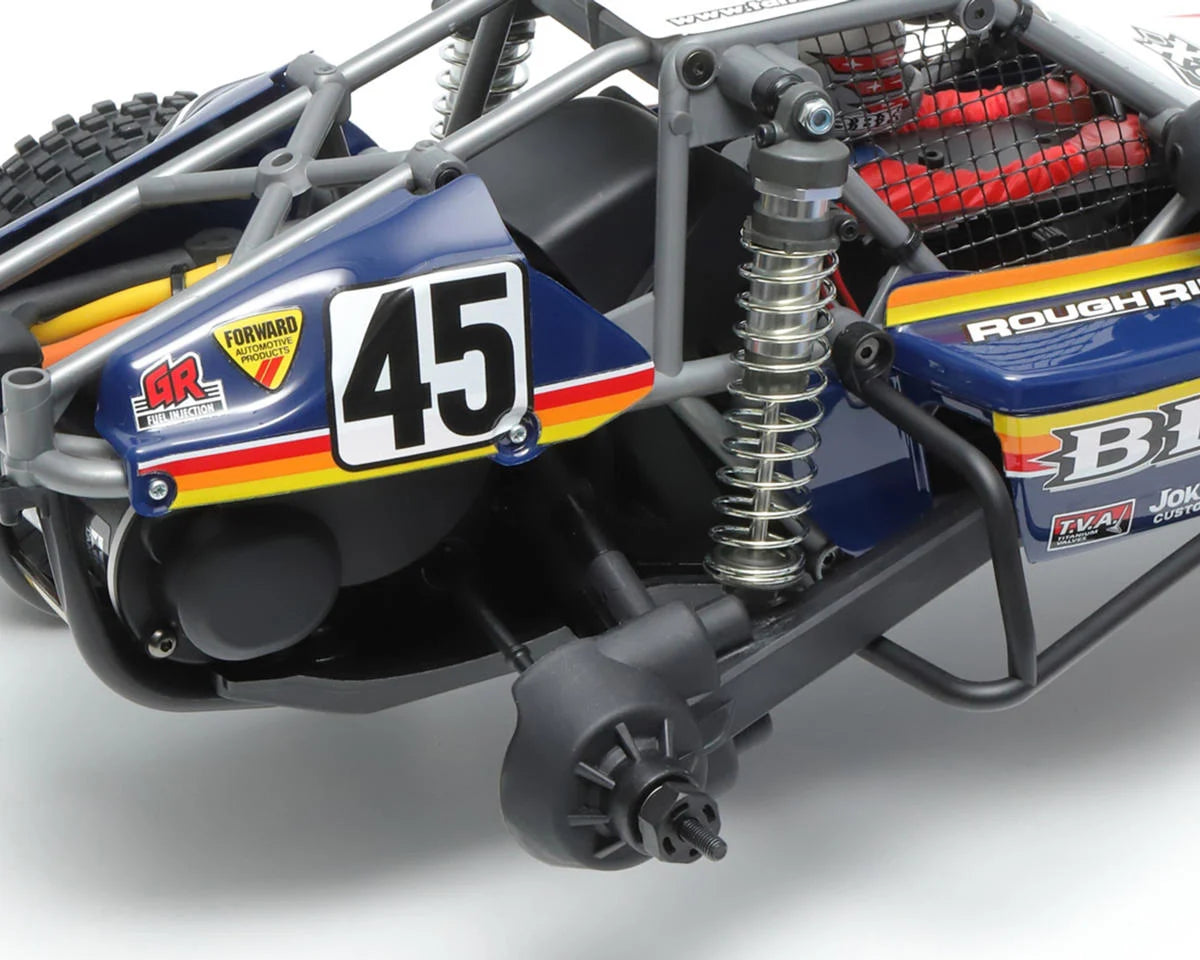 The Tamiya BBX 2WD Buggy was inspired by Tamiya's back catalog of iconic 2WD off-road buggies. This high performance off-road machine features a redesigned BB-01 chassis, hybrid monocoque-roll cage, and employs rear trailing arm suspension inspired by full-size UTV’s. All this is wrapped in a 0.7mm thick polycarbonate body designed and crafted by the renowned Japanese artist Atsushi Arino with a classic 1980’s-inspired livery, complemented by retro wheels and tires for a nostalgic touch.