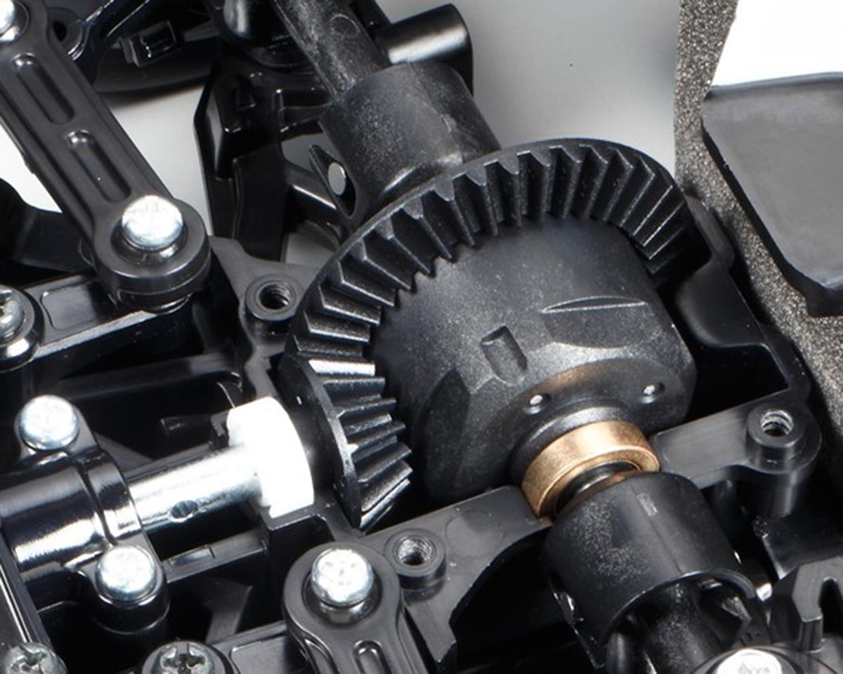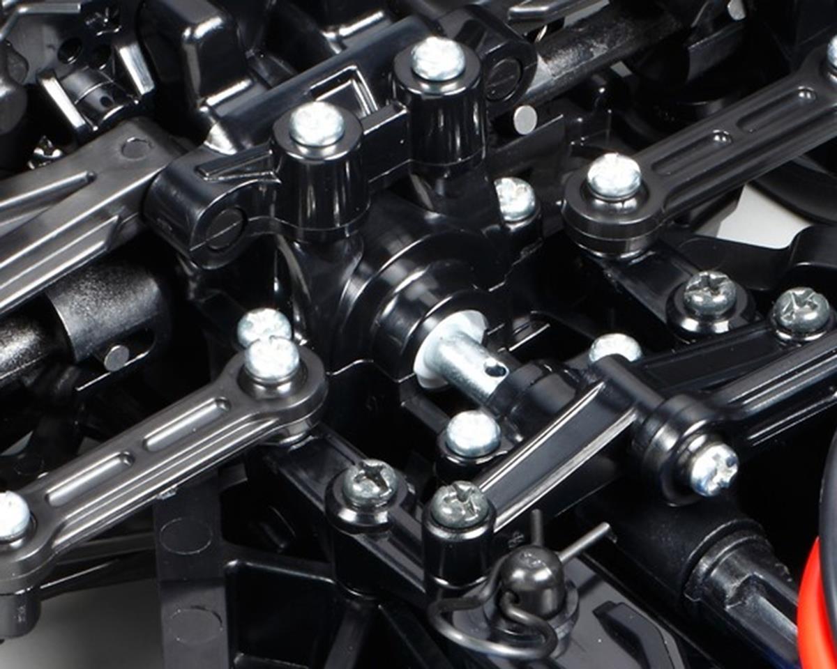 The shaft-driven 4WD TT-02 chassis employs a longitudinal layout with the battery on the left and the motor on the right, to give excellent stability. In addition, it features identical left and right suspension arms and uprights for ease of assembly, plus easy-to-maintain gearboxes. It is a highly adaptable chassis, as it offers 2 different wheelbases, 2 ground clearance settings and 2 tread set-ups in addition to a range of 10 possible gear ratios. It is not short on looks either, with brake disc-shaped wheel hubs and stylish front bumper supports.