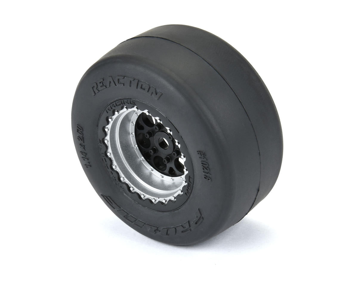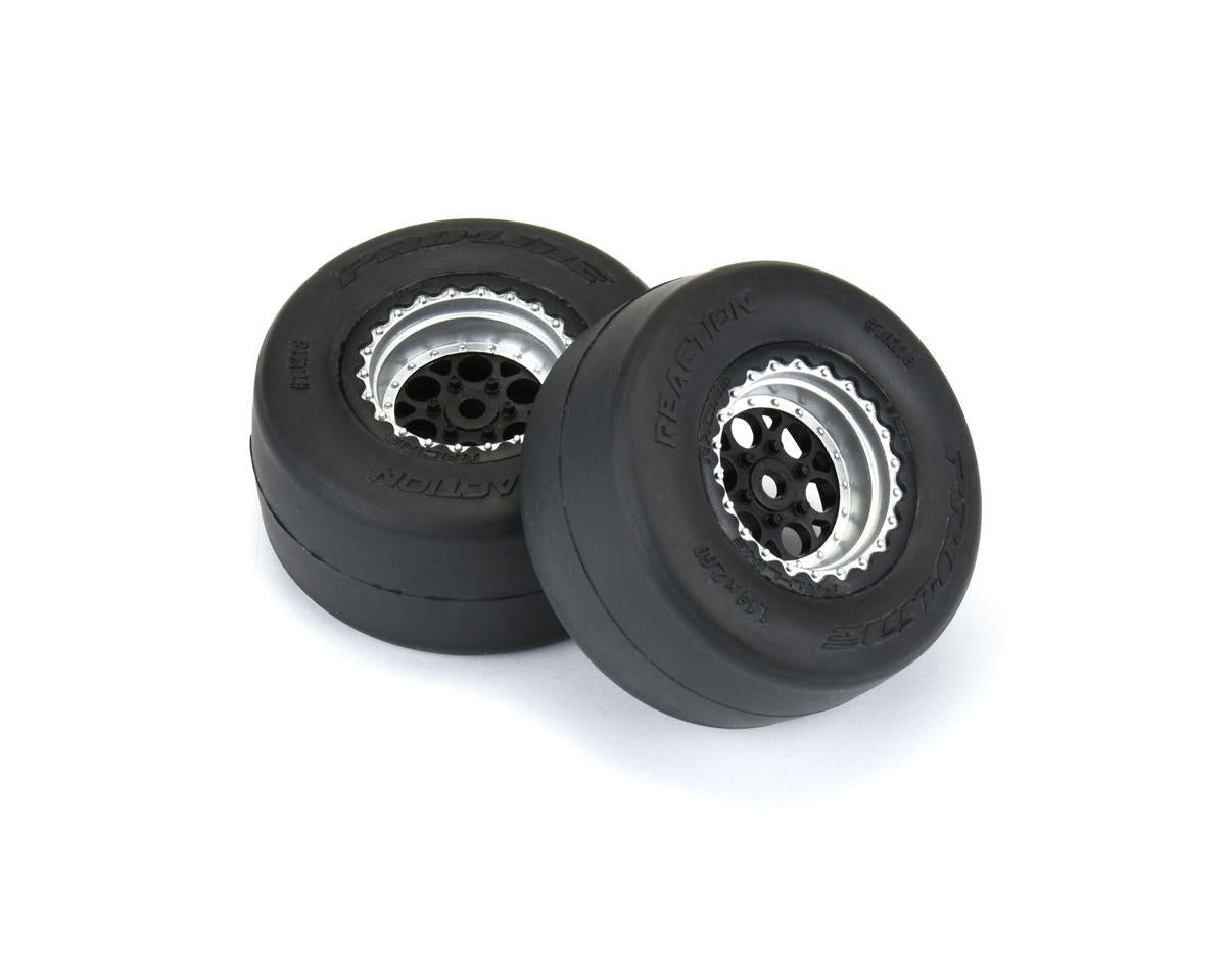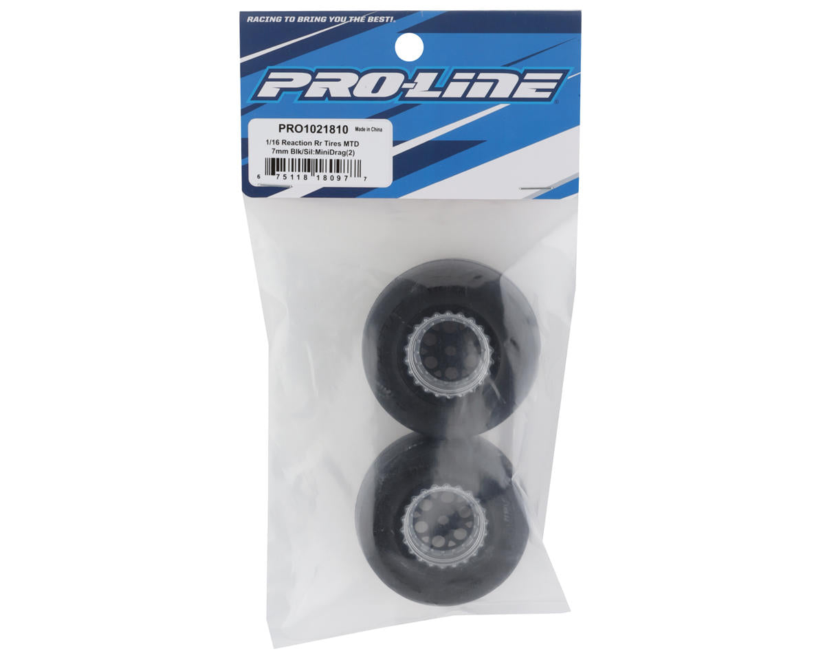 Pro-Line Losi 1/16 Mini Drag Reaction Rear Pre-Mounted MTD Tires with Showtime Plus black and silver Wheels. The Reaction is molded from a super soft compound and features a wider contact patch for massive grip at launch, which can mean the difference between victory and defeat. It comes pre-mounted to the Showtime Plus wheels which are 15% wider than the stock wheels for extra stability. The modern two-toned silver and black look create a unique scale look for your mini no-prep drag car! Get the maximum grip and stability your car deserves with the Pro-Line Reaction Mini No-Prep tires and elevate your performance level above the competition!