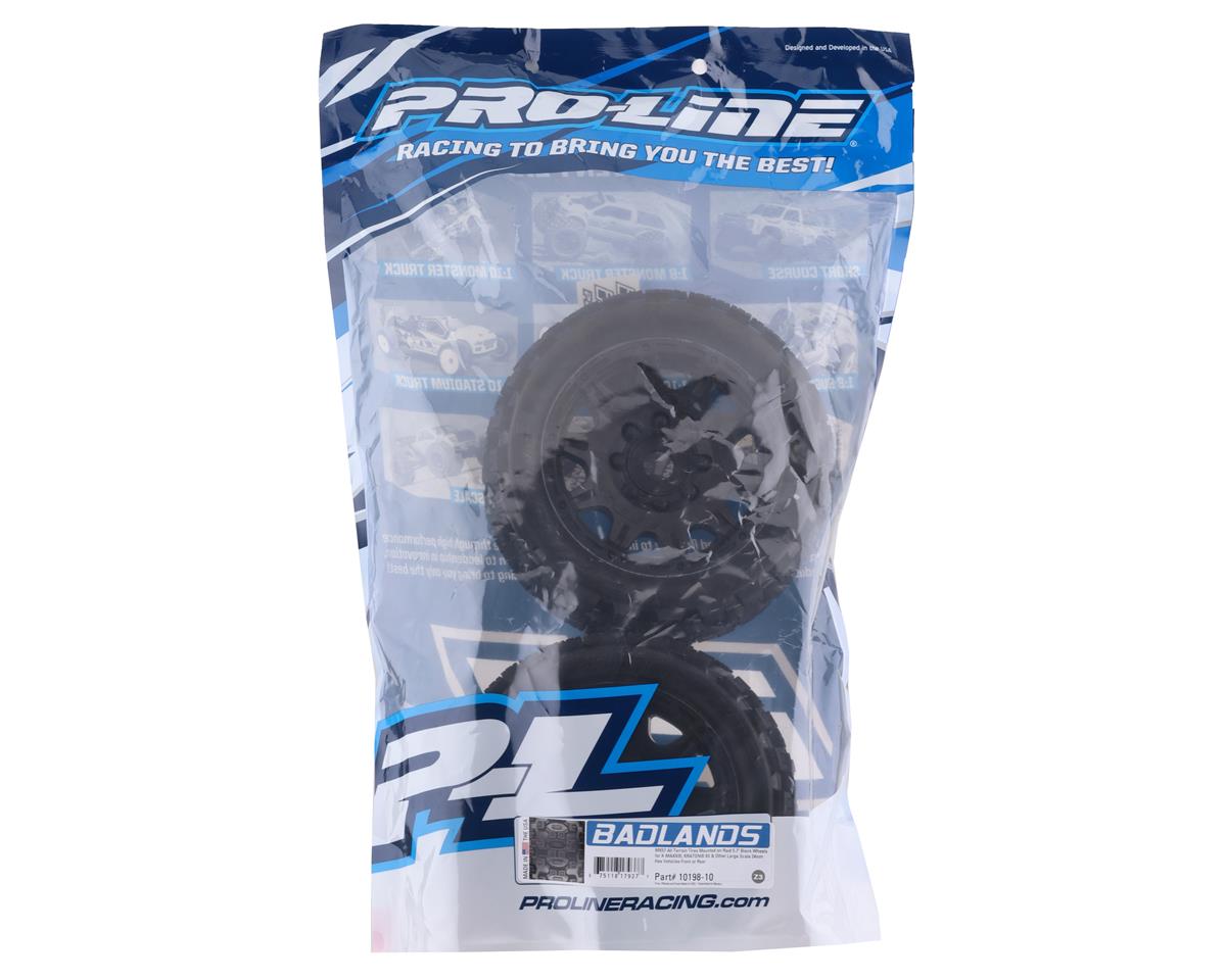 Pro-Line Badlands MX57 5.7" Pre-Mounted 1/6 Monster Truck Tires with Raid Wheels. These Badlands are based on the MX43 tire and features the same aggressive tread combination. Now mounted on the Raid wheels, these tire and wheels weigh 20% less than prior models. Pro-Line Badlands tires are known for having a sweet Motocross inspired tread and the Badlands MX57 tires kick that up a notch with a Bigger and Bolder knobby tread that matches modern MX tire design.