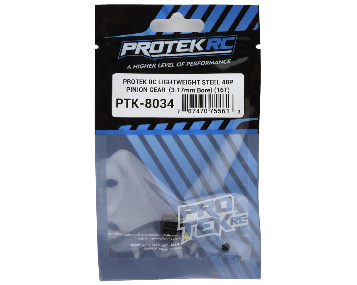 ProTek R/C Lightweight Steel 48P Pinion Gears are an affordable pinion gear option that doesn't skimp on quality. CNC machined from hardened steel material, these precision cut gears are durable and are perfect for any 48 pitch application. Plus, the 18 tooth and larger gears have been machined on the back side to remove as much weight as possible, without sacrificing strength. These gears are available in 12-41 tooth variants, and the tooth count is engraved on the gear for easy identification. Each gear includes a setscrew to make installation easy. Choose the tooth count you need from the pull down menu above.