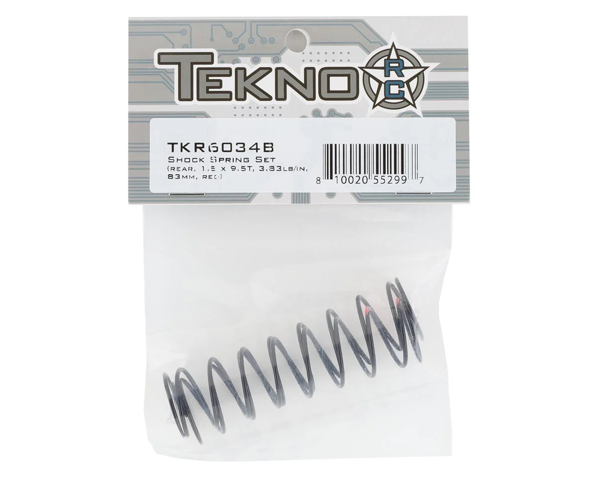 Tekno RC 83mm Rear Shock Spring Set. These optional springs are intended for the Tekno RC EB48 2.0 and ET48 2.0. The team at Tekno RC developed these springs to boost corner speed and provided more consistent landings. On corner exiting, these springs provide improved rear end support and are longer to cover the entire range of shock travel. Package includes two rear shock springs.