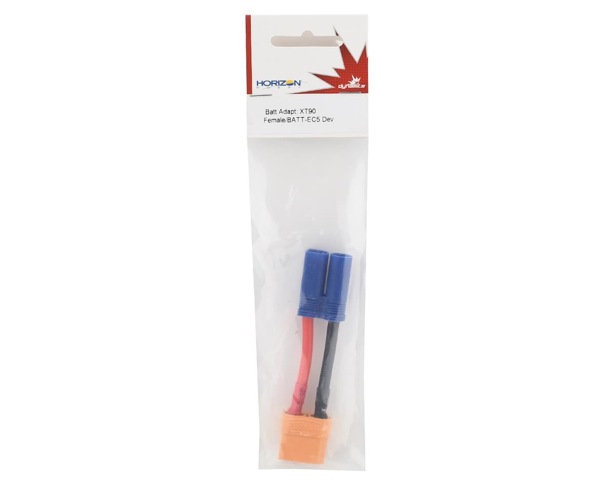 This is the Dynamite XT90 to EC5 Connector Adapter. This adapter features an XT90 female connector on one end, and a male EC5 connector on the other end. Total adapter length is about 3.5 inches.