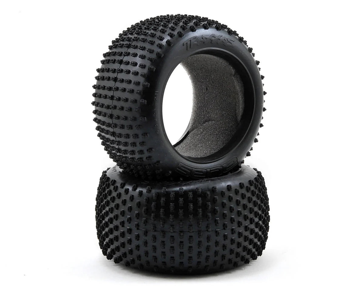 This is a pair of Traxxas "Alias" rear tires with foam inserts. Whether racing on a track or tearing across a back lot, the rear Alias tires are the perfect choice. They feature a non-directional design for no-hassle, no-worry mounting. The Alias 2.8" rear tires integrate a rounded carcass and dual pin design that steps-up to keep the tires firmly planted on extreme off-road terrain. This tire combination is ideal for use on grass, loamy dirt, sand, and any other loose surface. The Alias rear tires feature a super soft rubber compound that supplies exceptional grip on asphalt and other hard packed surfaces. For a versatile stadium truck tire that is at home on the track or in the back yard get the Alias rear tires.