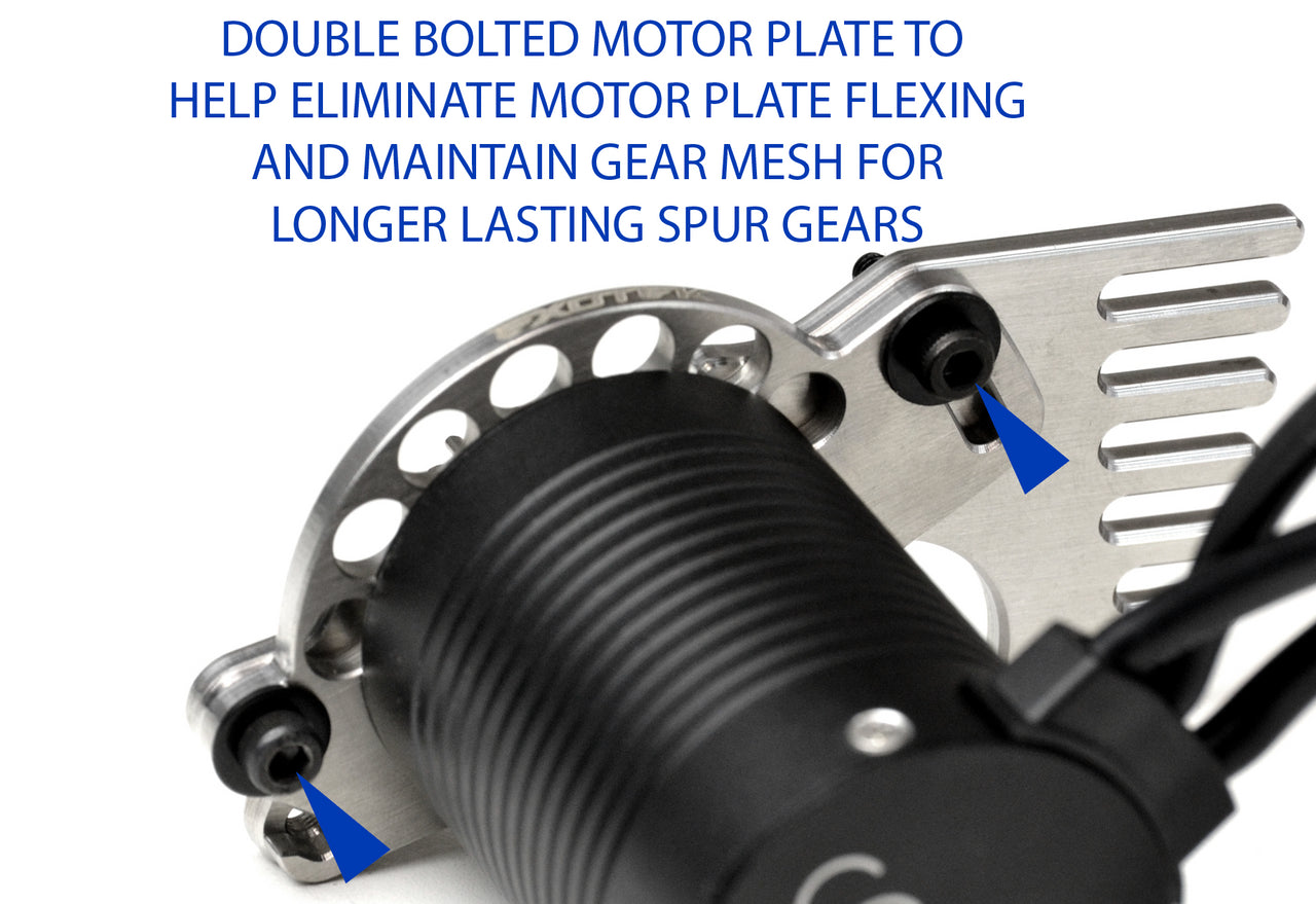 Extra stiff stainless steel construction insures proper gear mesh when jumping and bashing and adds an extra mounting screw that greatly reduces motor plate flexing as well.