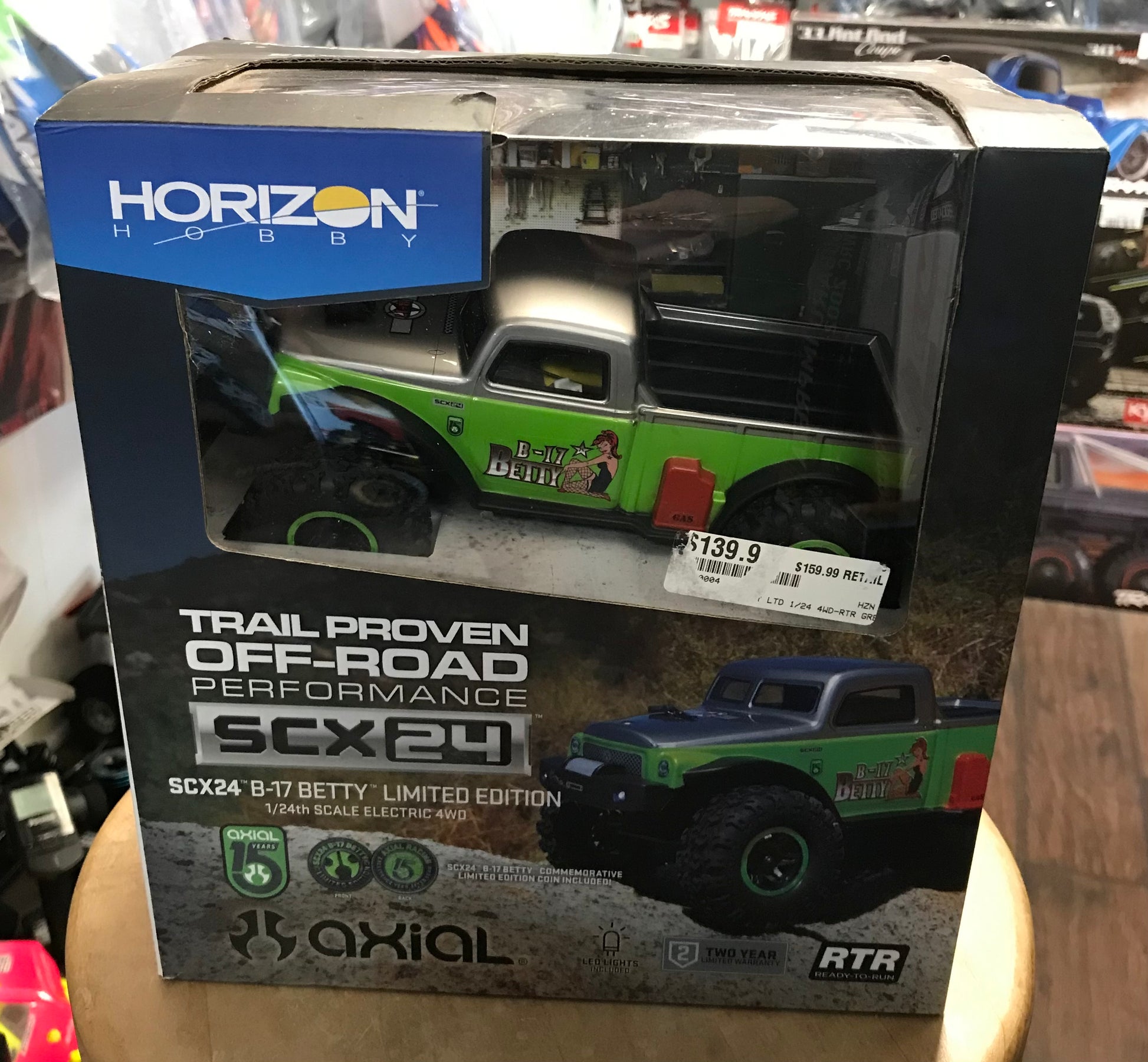 Axial 1/24 SCX24 B-17 Betty Limited Edition 4WD RTR @ Parkflyers RC Hobby Shop in Lakewood NJ, 55 Park Ave. S. Sunday-Friday, 11a-5p. No trades. USB and battery included.