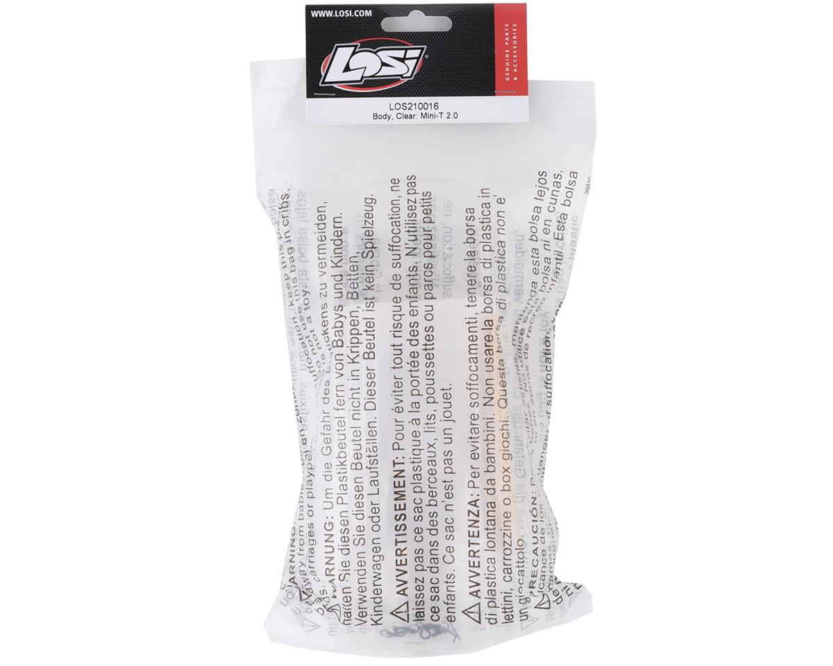 The Losi Mini-T 2.0 Clear Body Set is an optional accessory for the Mini-T 2.0, and is exactly what you need to set your ride apart from the rest. Package includes pre-cut clear body, wing, decal sheet, body clips and hardware.The Losi Mini-T 2.0 Clear Body Set is an optional accessory for the Mini-T 2.0, and is exactly what you need to set your ride apart from the rest. Package includes pre-cut clear body, wing, decal sheet, body clips and hardware.