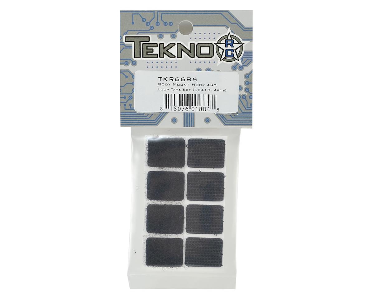 Tekno RC EB410 Body Mount Hook & Loop Tape Set. This is a replacement for the Tekno EB410 4wd buggy. Package includes four pieces of hook side tape, and four pieces of loop side tape.