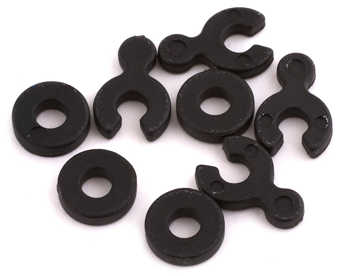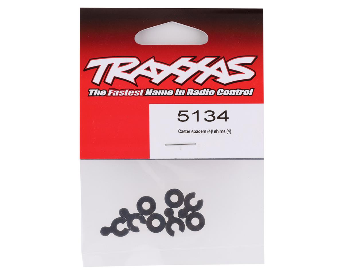 This is a pack of four replacement caster spacers and four replacement shims for the Traxxas Revo monster trucks. These spacers are used to adjust the caster angle and for the front of the truck as well as correctly space the rear arms on the bulkheads.
