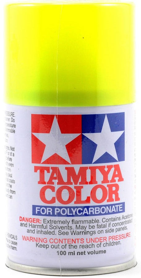 This is a 100ml can of Tamiya PS-27 Fluorescent Yellow Lexan Spray Paint. These spray paints were developed especially for decorating transparent polycarbonate bodies used in R/C car modeling. Each can contains 100ml (3oz) of paint, which is the appropriate amount for finishing one 1/10 scale model.