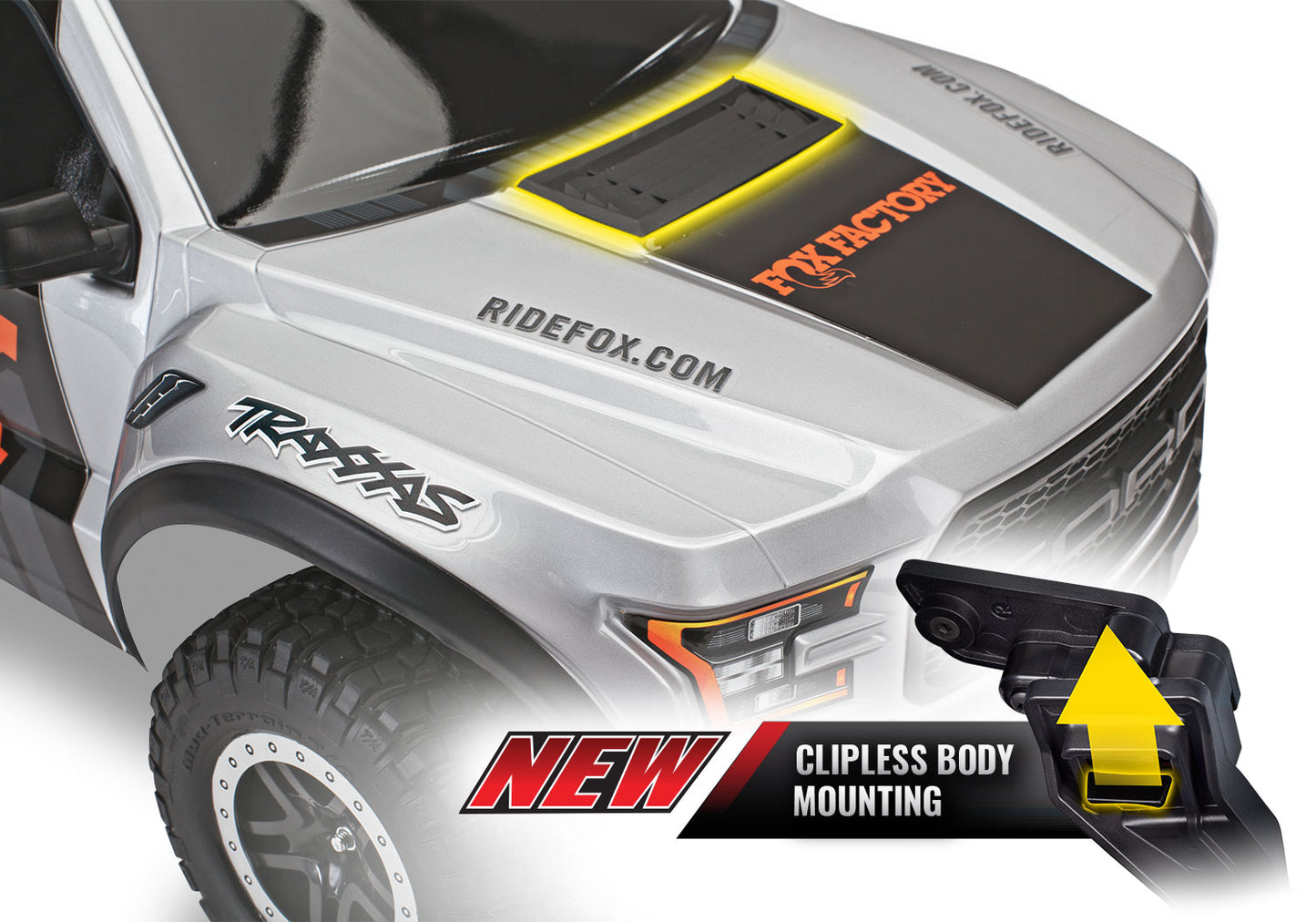 Traxxas has equipped this stunning truck with a sleek and clipless body that comes fully detailed from the factory. With an injection molded grille, front bumper, and body accessories that capture the full depth and detail of Ford's original design, this body is sure to turn some heads wherever the F-150 Raptor takes you. The Raptor's hidden latching system maximized convenience and scale realism by removing traditional body clips that would normally interrupt the body's clean and professional design. This innovative clipless body system features secure mounting with quick and easy removal. No posts, no clips, just drop the body onto the chassis, snap it into place, and let the adventure begin.
