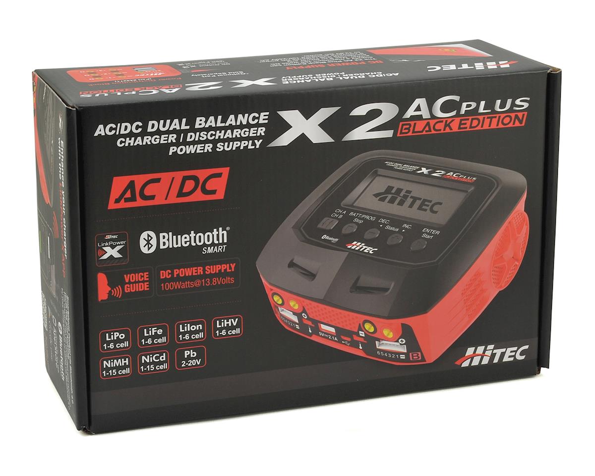 The expansion of the Hitec charger line continues with the introduction of their X2 AC Plus Black Edition AC/DC Dual Balance Charger/Discharger with built-in power supply. With increased capacity and compatibility, this portable, compact and reliable charging unit affords flexible charging of all battery chemistries whether you are at home or in the field. Its leading-edge power distribution mode allows efficient assignment of output power based on individual battery requirements while the Voice Guide feature makes for easy, user-friendly communication. With a built-in 10-amp power supply, internal balancing circuits and 10 different charge/discharge profiles, the X2 AC Plus Black Edition is an absolute powerhouse. Featuring our "SCAN TO GO" and Smartphone control via Bluetooth, this charger delivers the high performance and convenience that you can always expect from Hitec.
