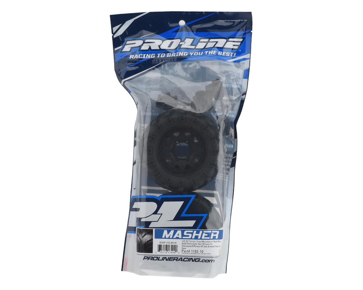 This is a set of two Pro-Line Masher 2.8 Tires Pre-Mounted on Raid Electric Rear Wheels. These pre-mounts are intended for use on the rear of the Traxxas electric Stampede and Rustler trucks. Pro-Line takes the guess work out of your glue job by doing the mounting for you so you can spend your time having fun! The Mashers ultra-modern Chevron Style tread digs deep into the roughest and toughest terrain and looks mean doing it. The side tread of this behemoth tire features a hook shape that craters the dirt and achieves unparalleled side traction. After fitting your truck with this massive Masher tread you'll be ready for back yard thrashing and mashing on any neighborhood terrain. The Masher 2.8” tire is perfect for the Traxxas Stampede 2WD and 4WD (Front and Rear) and Traxxas Rustler 2WD and 4WD (Front and Rear) and the JATO Rear. Impress your friends – Get a set of Pre-Mounted Mashers today!