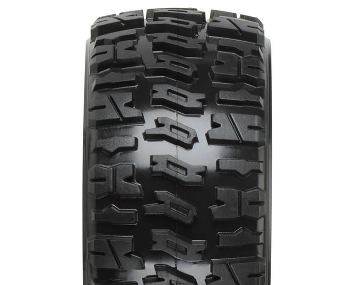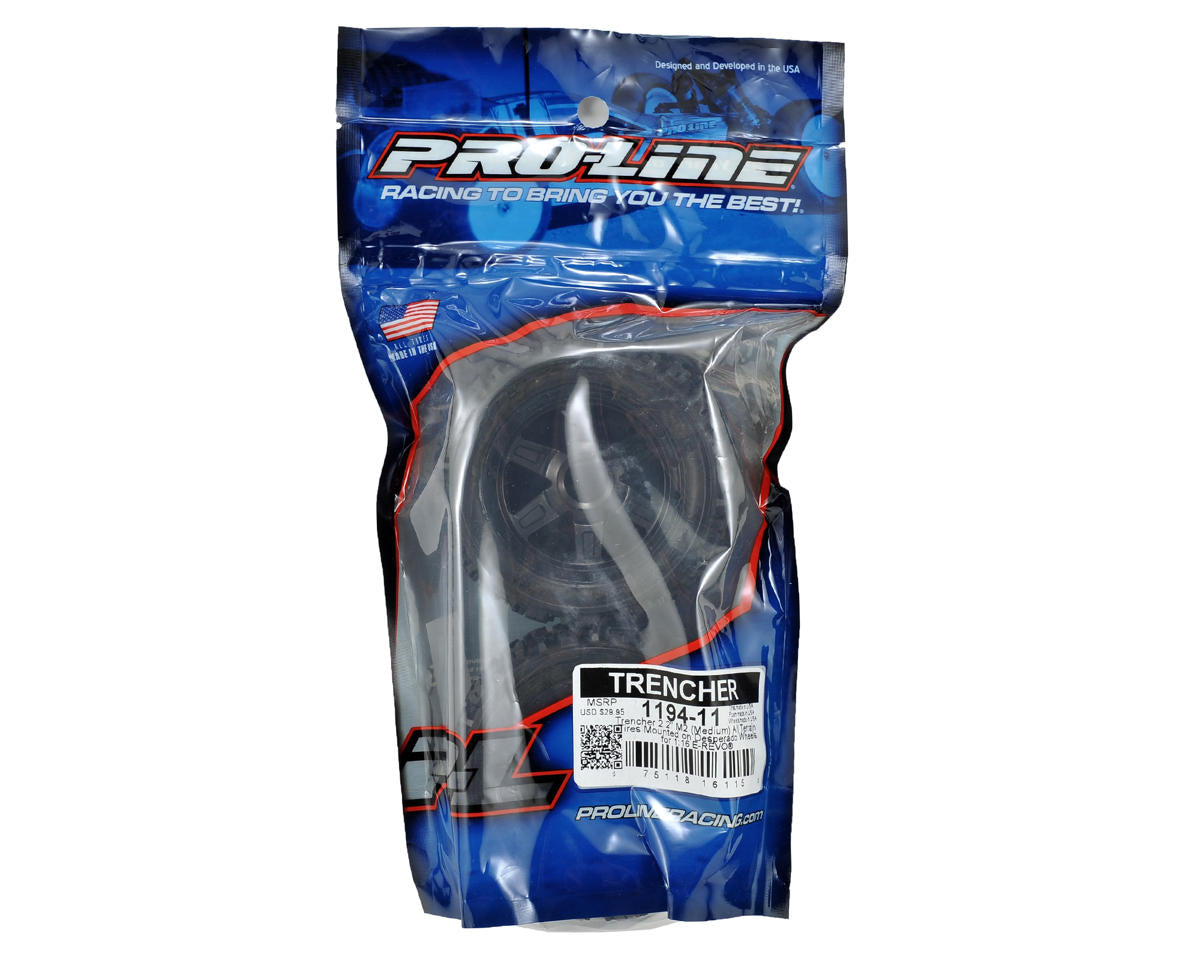 This is a pack of two Pro-Line Pre-Mounted Trencher Tires, Pre-Mounted on Black Desperado Wheels and are intended for use with the Traxxas 1/16 scale E-Revo. Leave a mark with your Mini E-REVO wherever you go with Pro-Line’s Trencher tires. The Trencher 2.2” tires are designed to give your Mini optimal traction on just about any surface. Super cool horizontal H shaped treads give your truck ridiculous amounts of forward bite. With a tall tread height, you’ll find that durability and longevity are second to none. The Trencher is the Ultimate Bashing tire!