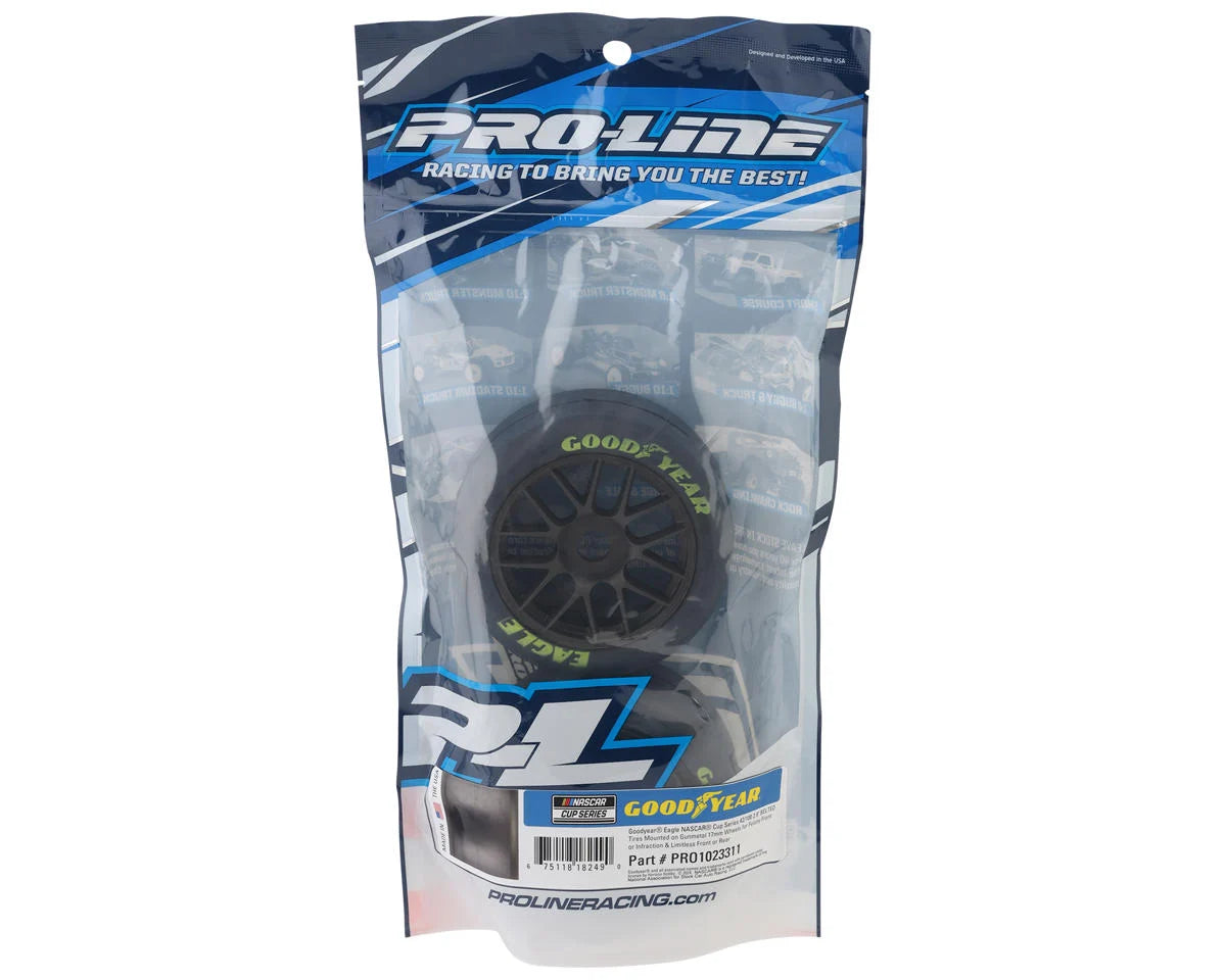 Pro-Line Infraction 6S Goodyear NASCAR Car Belted Pre-mounted Tires. The Goodyear Eagle NASCAR Cup Series tire is BELTED to handle extreme power and high speeds with ease. No tire ballooning here! These slick tires and Cup Series wheels give your Infraction 6S a super scale look with yellow printed sidewall lettering and gunmetal wheels, just like the Next-Gen Cup cars use! Pair these wheels and tires with the NASCAR Cup Series Ford Mustang body (PRM158700) to completely transform your ride into a Stock Car racing machine!