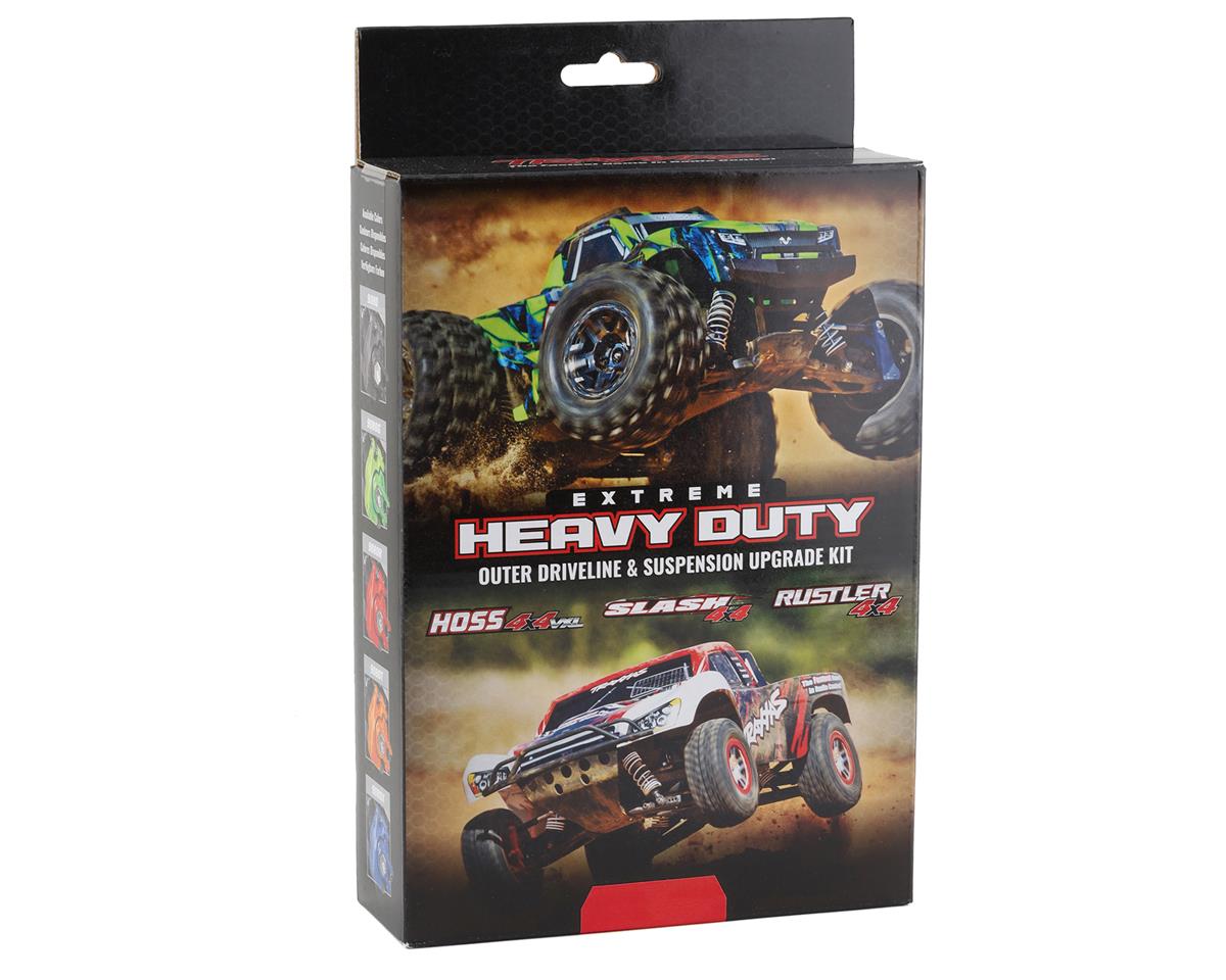 The Traxxas Hoss/Rustler/Slash 4x4 Extreme Heavy Duty Suspension Upgrade Kit has been designed to turn your ride into the ultimate bashing machine. This optional suspension upgrade kit is intended for the Traxxas Hoss 4x4, Rustler 4x4 and Slash 4x4. The kit uses fully updated suspension components, as well as Maxx Duty driveshafts with 6mm stub axles and steel wheel hexes.