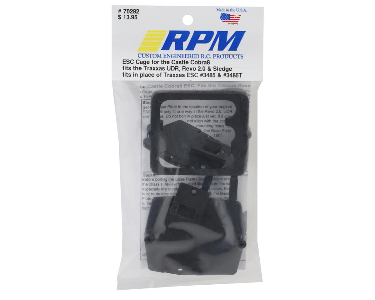 RPM Castle Creation Cobra 8 ESC Cage Mount. Designed to Provide a solid sturdy mount to lock your Cobra 8 ESC in place for 6S Traxxas platforms! In addition, this mount allows the ESC to be run with or without the cooling fan and features air channels along the sides of the ESC to allow air movement and help lower the ESC's temperature! Package includes one ESC mount with assembly hardware.
