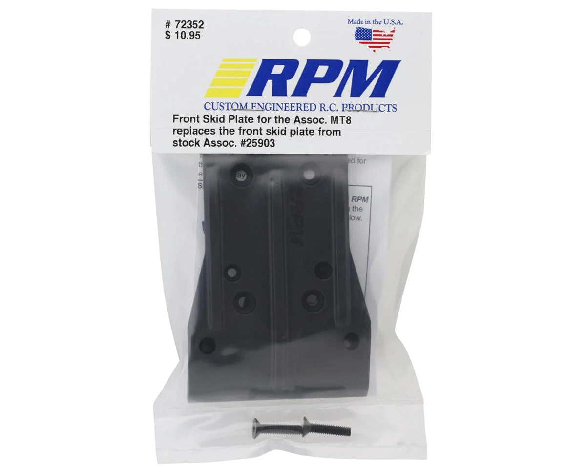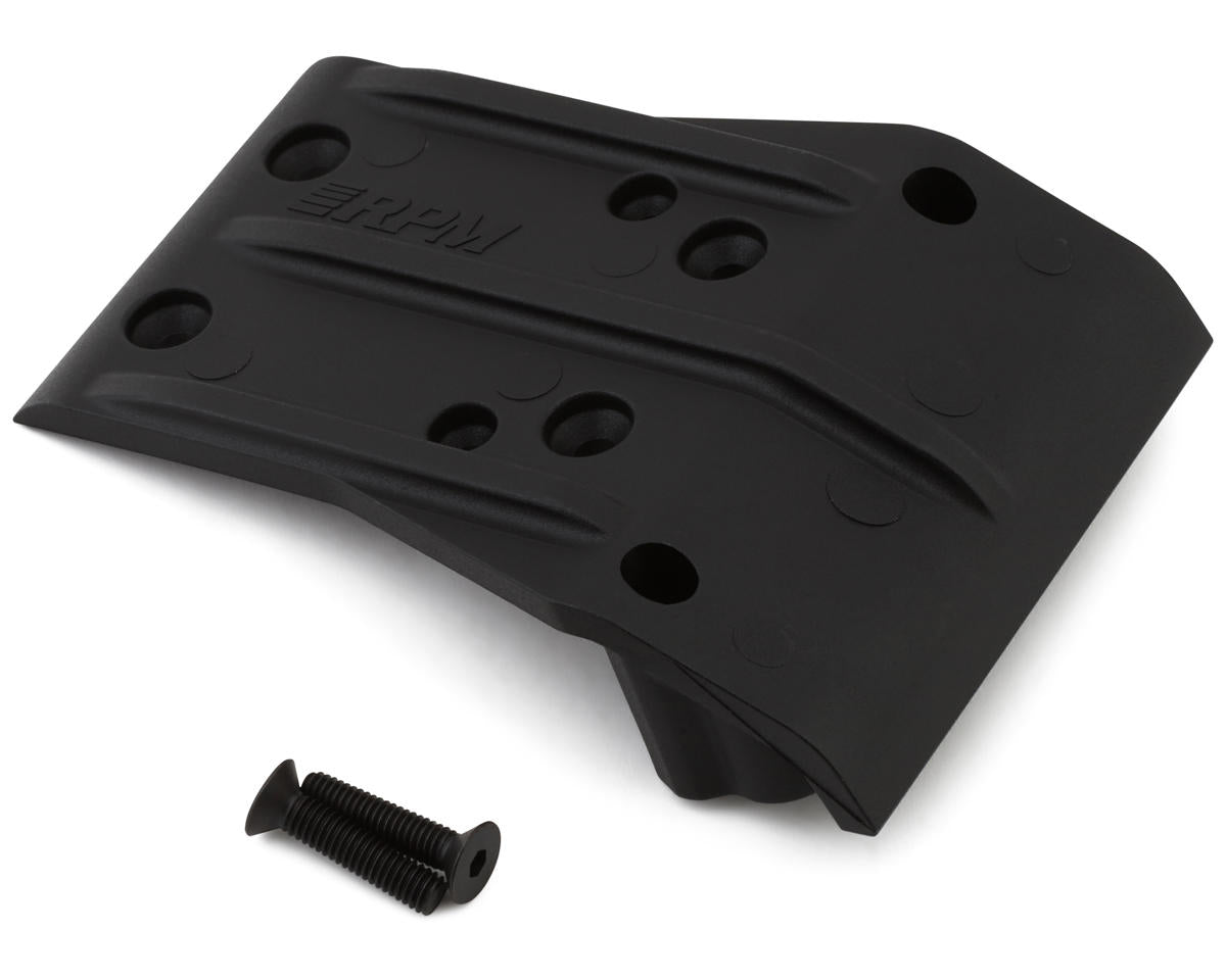 This is the RIVAL MT8 Front Skid Plate from RPM. Designed to improve durability and protect the aluminum chassis, this skid plate extends rearward to cover more of the chassis and protect it from rocks and debris. Featuring low-friction skid rails, it enhances the vehicle's ability to transition over obstacles while increasing strength and wear resistance. Molded in black from RPM's exclusive engineering-grade nylons, it offers unmatched strength and durability.