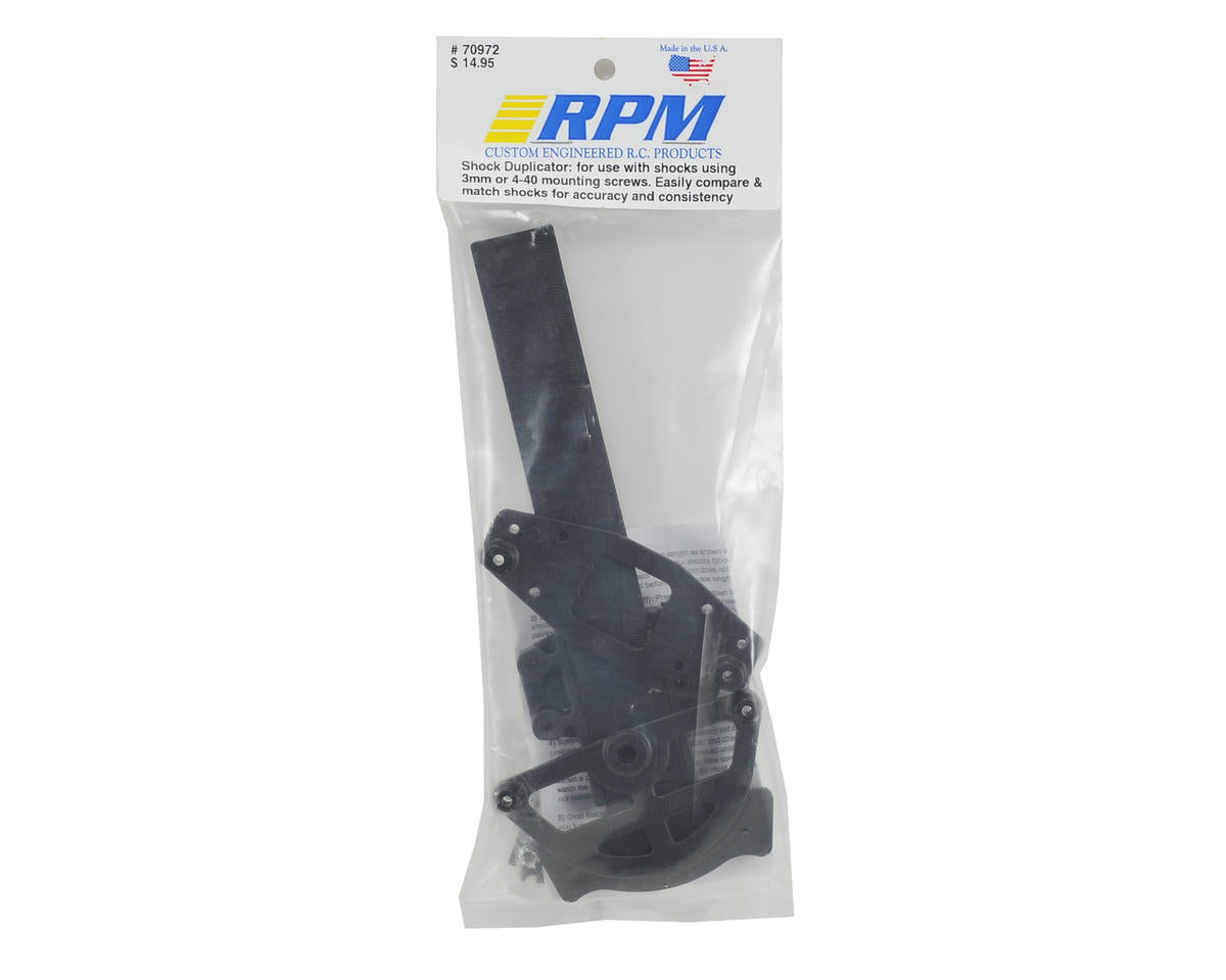 Tech Notes: The RPM Shock Duplicator works with most 1/8, 1/10 or 1/16 scale shocks using 4-40 or 3mm mounting screws. Maximum shock length is 6-1/4” (158mm). Shocks not included.
