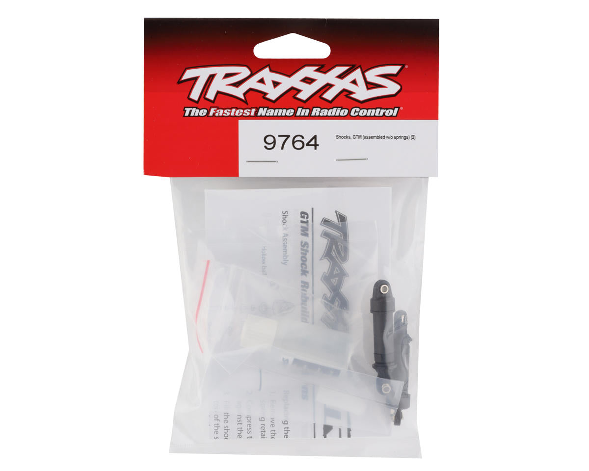 Traxxas GTM Shocks without Springs. These are replacement shocks intended for the TRX-4M rock crawler. Package includes two pre-assembled shocks without springs and one bottle of shock fluid.