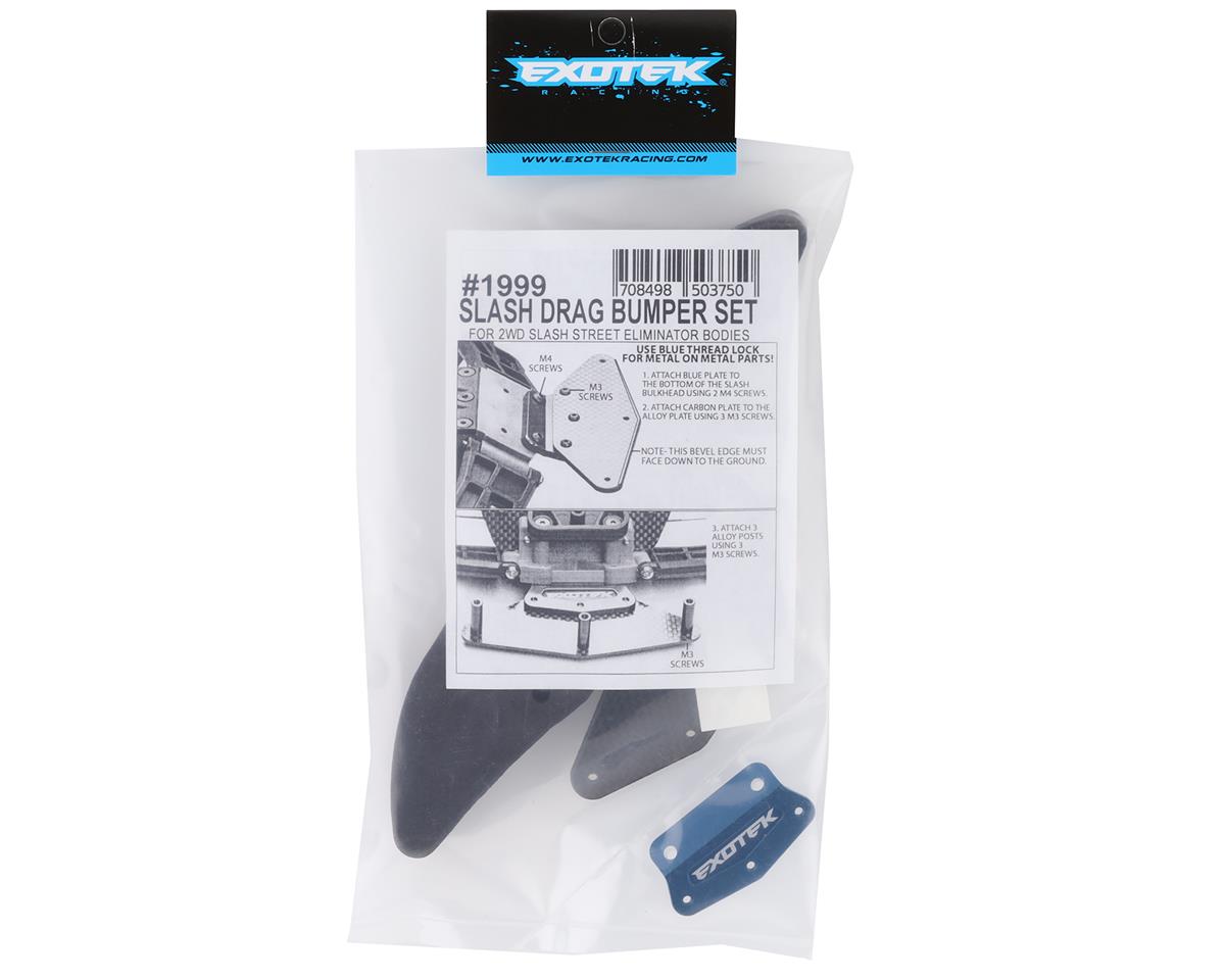 This is an Exotek Traxxas Slash Aluminum Drag Front Bumper Set, a heavy-duty bumper set made of aluminum alloy, carbon fiber and dense foam. This pack includes a heavy duty alloy and carbon fiber mounting base that secures the extra wide high density foam bumper, the same high impact foam used in touring car racing. Inside the foam bumper are 3 alloy posts for extra secure foam bumper mounting.