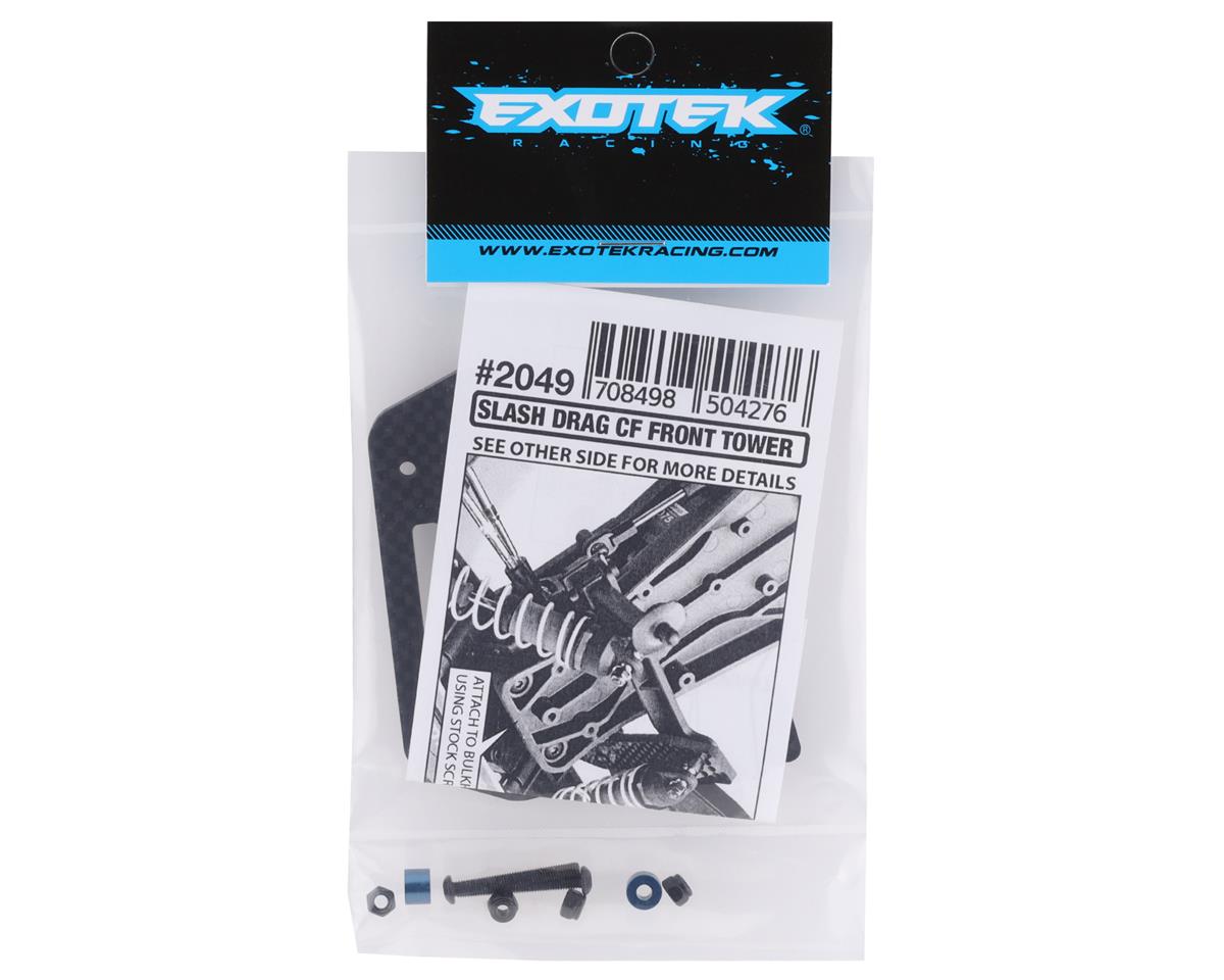 The Exotek Slash Drag 4mm Front Carbon Fiber Tower is a heavy duty 4mm thick carbon tower option for the Drag Slash and 2wd Slash based street eliminator cars. This tower is stiffer than stock to provide improved high speed handling and uses the stock shocks and body mounts. Plus, this tower offers additional shock mounting holes for more tuning options but requires removal of the stock body mount (use Exotek Slash bumper set EXO1999 with optional body posts).
