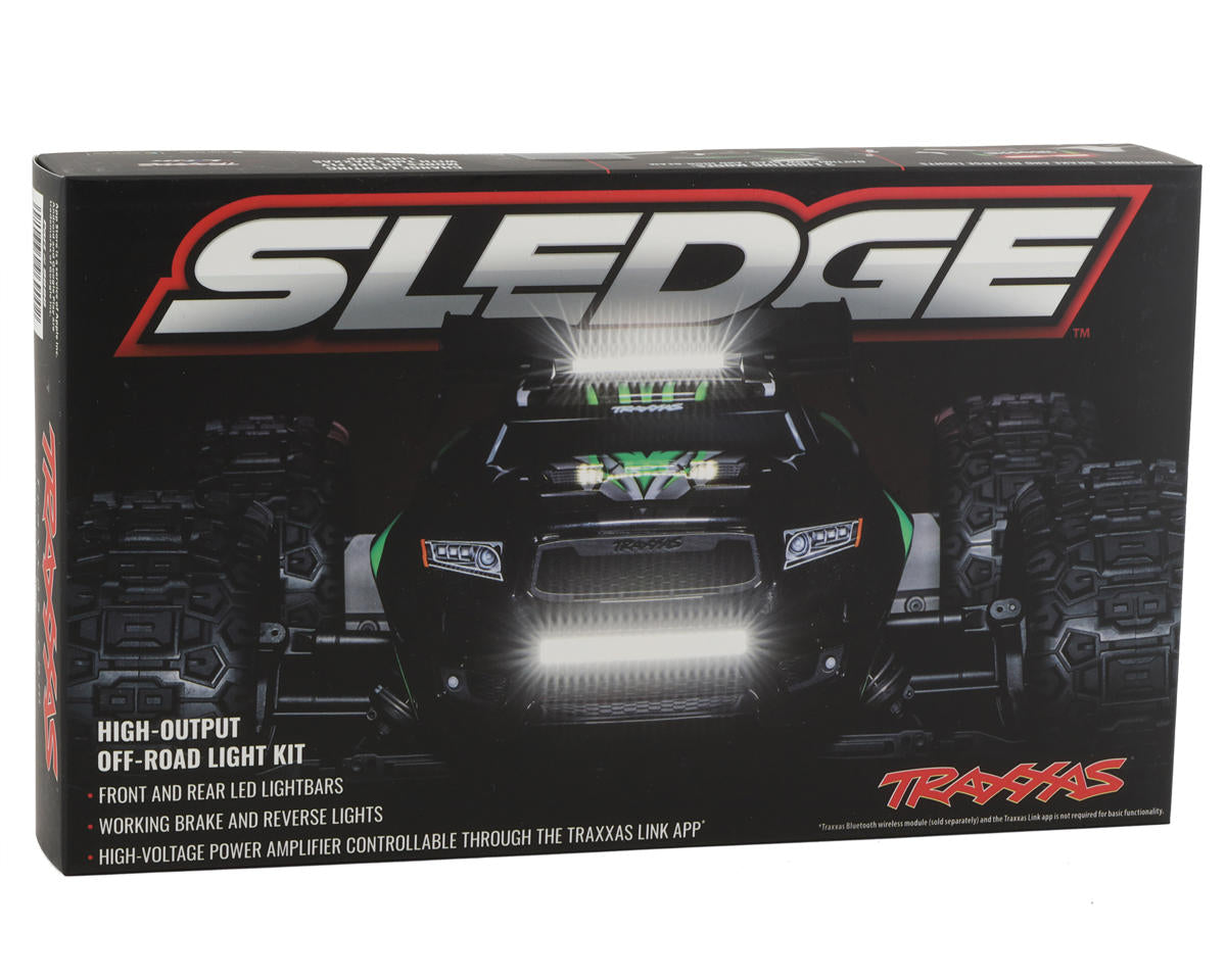 Traxxas Sledge Complete High-Output LED Light Set. This High-Output Light Kit extends your fun into the night with dual front light bars to illuminate the path ahead. A rear light bar with integrated brake lights allows you to track Sledge’s progress from behind. The smart brake lights work when brakes are applied in both forward and reverse directions. This eliminates the common and annoying problem with generic aftermarket systems that turn on the brake lights while reversing. The Sledge’s rugged roof skid protects the light bars against impacts with fully waterproof construction for worry-free performance.