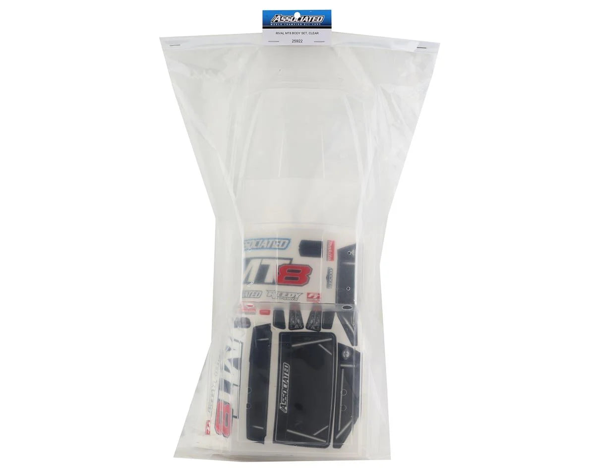 Team Associated RIVAL MT8 Body Set. This optional clear body set is perfect for adding a custom paint scheme to your Team Associated Rival MT8. Made from durable polycarbonate, this body set is designed to bash and blast. Package includes one clear body and one decal sheet.