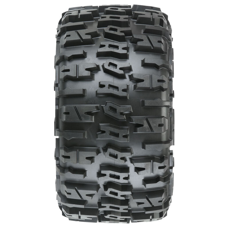 This is a pair of pre-mounted Badlands MX43 tires for X-MAXX®. Pro-Line is ready to unleash the long-awaited tire solution for X-MAXX® owners with the Biggest and Baddest tire and wheel combo ever conceived: the Badlands MX43 mounted on Impulse Wheels! Pro-Line Badlands tires are known for having a sweet Motocross inspired tread and the all-new Badlands MX43 tires kick that up a notch with a Bigger and Bolder knobby tread that matches modern MX tire design. These tires have been developed from the ground up for extreme X-MAXX® punishment with an all-new ultra-durable compound that prevents tire ballooning even at high speeds. The Badlands MX43 features Pro-Line's ground breaking proprietary Pro-Loc Technology that creates an ultra-secure bond to Pro-Line's Impulse Pro-Loc X-MAXX® wheels while still being removable when required. The Badlands MX43 is a true All-Terrain tire that will find traction on any surface but is best suited for loose & loamy dirt, mud or grass. Just imagine your X-MAXX® throwing up huge rooster tails with these aggressive looking tires!