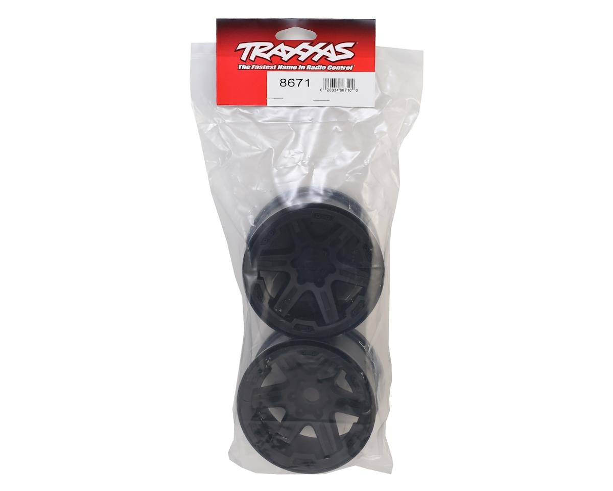 This is a pack of two replacement Traxxas 17mm Splined Hex 3.8" Monster Truck Wheels in Black color. These wheels feature a 17mm splined hex, making them only compatible with Traxxas 17mm splined axle hexes.