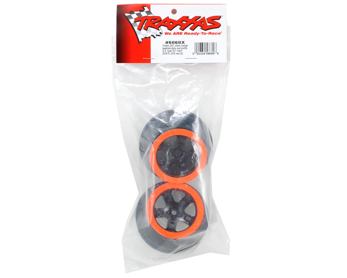 This is a set of two Traxxas 2.2/3.0 Dual Profile SCT Rear Black Wheels with an Orange Beadlock, and are intended for use on the front and rear of the Traxxas Slash 4x4 and the rear of the Traxxas Slash. The design of the SCT wheel features a black center and color molded orange beadlock detail for a realistic look. Fully compatible with factory Traxxas and aftermarket 2.2/3.0 tires, the wheels feature 12mm hexes and the same offset as Slash 2wd rear wheels.
