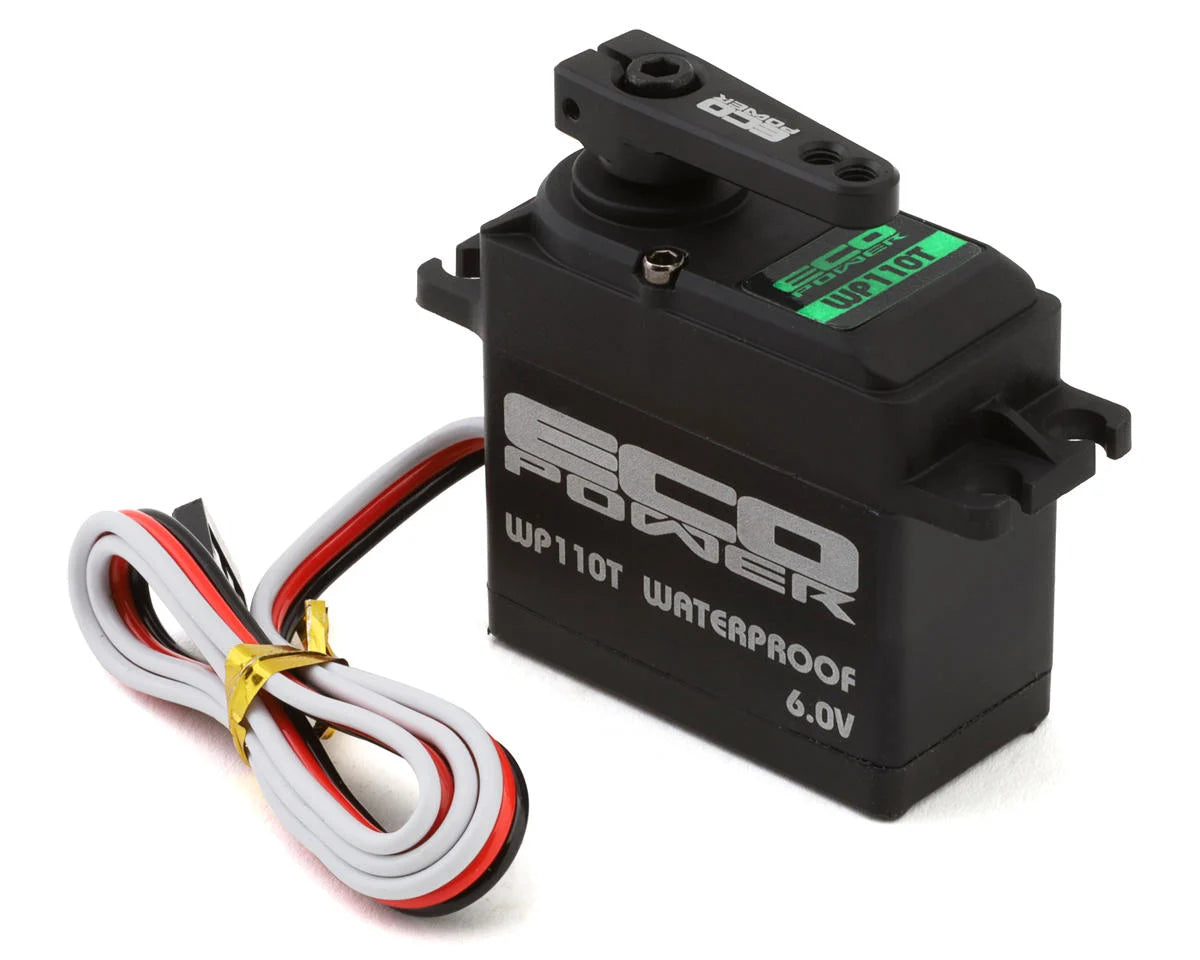 The EcoPower WP110T Cored Waterproof "High Torque" Metal Gear Servo is a great choice if you are looking for an affordable, waterproof RTR upgrade. The WP110T pumps out 280 oz-in of torque at 6.0V, making it an excellent option for 1/10 monster trucks, 2WD and 4WD 1/10 buggies, as well as boats, and other surface applications that can benefit from a high torque, waterproof servo.